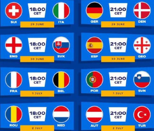 Romania v Netherlands, Austria v Turkey, England v Slovakia, Switzerland v Italy