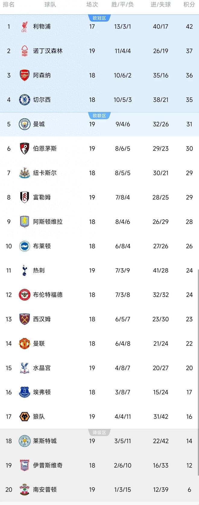 Beijing time on December 30, the 19th round of the English Premier League began a contest, Spurs were defeated, the dark horse Nottingham Forest won five consecutive wins, Manchester City gained a long-lost victory, here is a brief description of the game process and the team's real-time points ranking.
