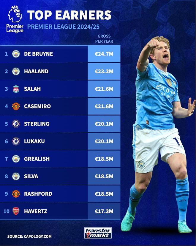 Recently, the German Transfer Market listed the annual pre-tax salaries of Premier League players for the 2024/25 season. Among them, De Browne, Haaland, Casemiro ranked the top three.