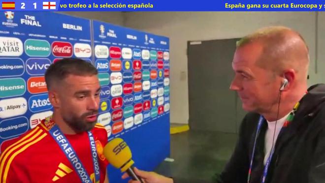 Live on July 15, the men's European Cup final, Spain beat England 2-1, the team won the fourth European Cup championship. Spain right back Carvajal was interviewed by Sale radio after the game.