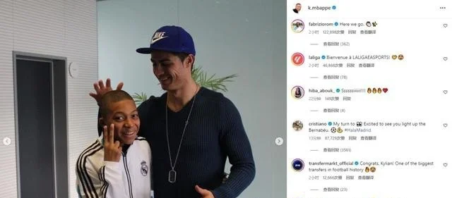 Beijing time in the early morning of June 4, in the Real Madrid official announcement of the signing of Mbappe, the French genius also the first time in the social media excited to express their feelings, he also emotional sunshine and idol C Luo's photo. C Luo himself also quickly under this dynamic message comment interaction, congratulate Mbappe to join Real Madrid.