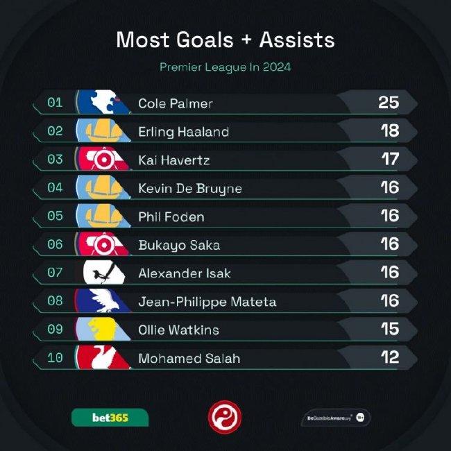 In this list, Palmer has scored or assisted 25 times directly, the most of all Premier League players, Haaland has been directly involved in 18 goals, ranking second, and Haverts is third with 17 goals.