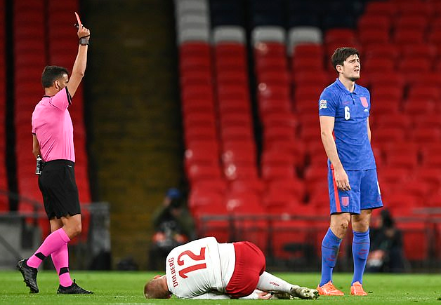 England lost 1-0 at home to Denmark, and Maguire's red card was undoubtedly the turning point in the game. The United centre-back made two rather reckless tackles that saw him sent off after just half an hour.